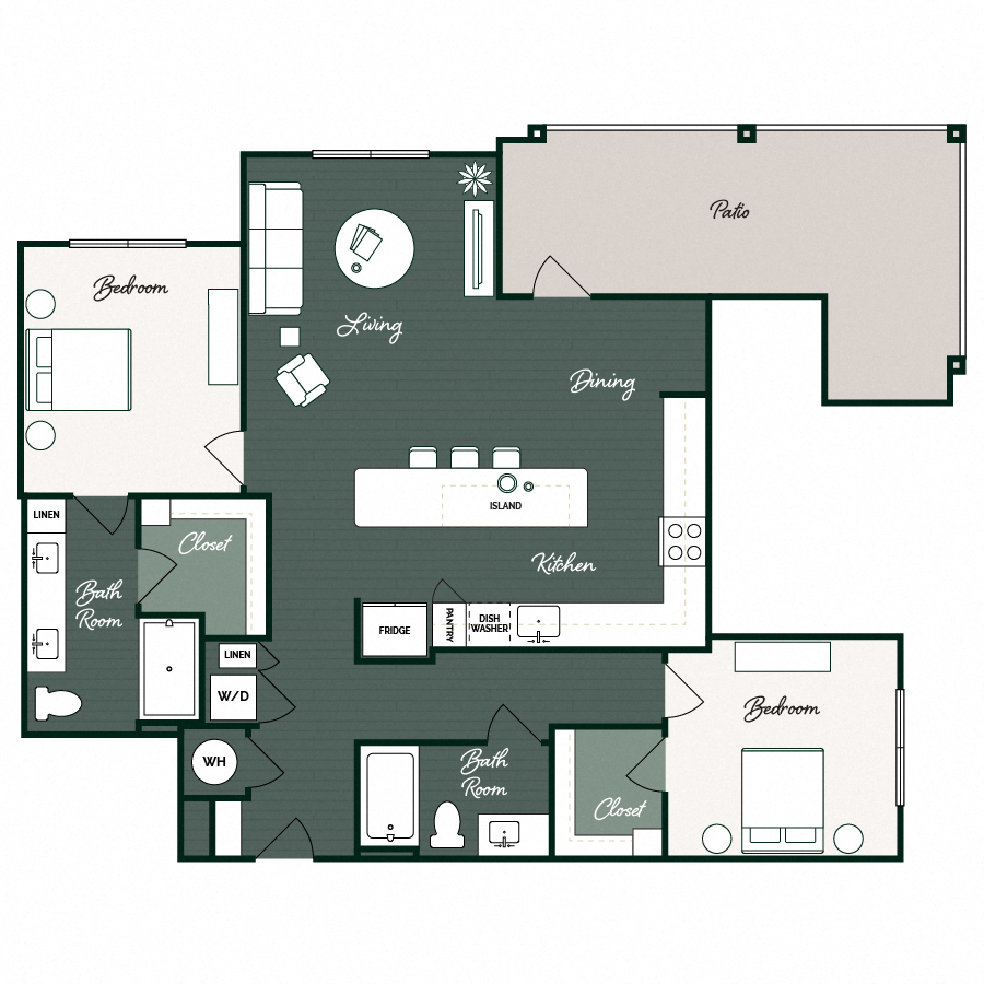 Rendering of the B2 floor plan with 2 bedroom[s] and 2 bathroom[s] at Gin Mill